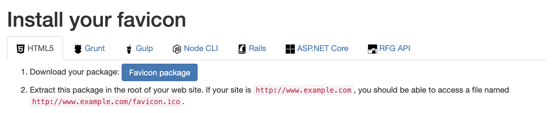 and click the button Generate your Favicons and HTML code to install your package