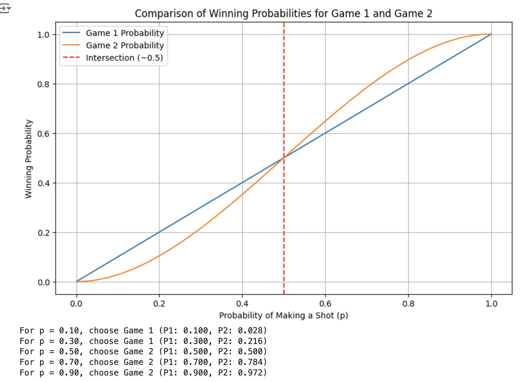 print(f"For p = {p:.2f}, choose Game 2 (P1: {g1:.3f}, P2: {g2:.3f})")